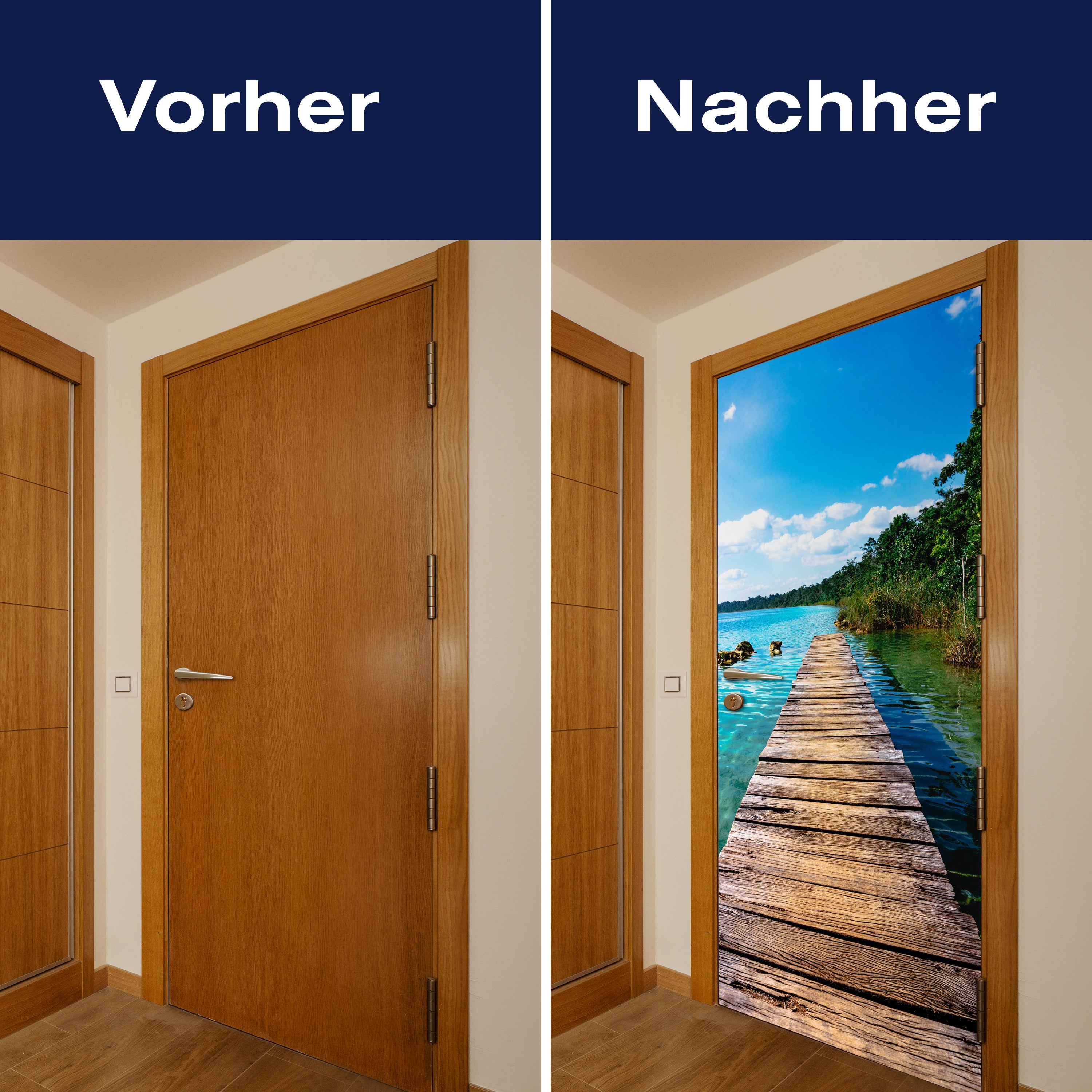Hast du jemals darüber nachgedacht, wie eine einfache Veränderung deinen Wohnraum komplett umgestalten kann? Die Türtapete Steg Wasser Wald Steine Holz von Wandmotiv24 ist genau das, was du brauchst, um deinem Zuhause einen Hauch von Einzigartigkeit und Stil zu verleihen. Dieses einzigartige Design erzielt eine atemberaubende visuelle Wirkung, die jeden Betrachter in den Bann zieht.