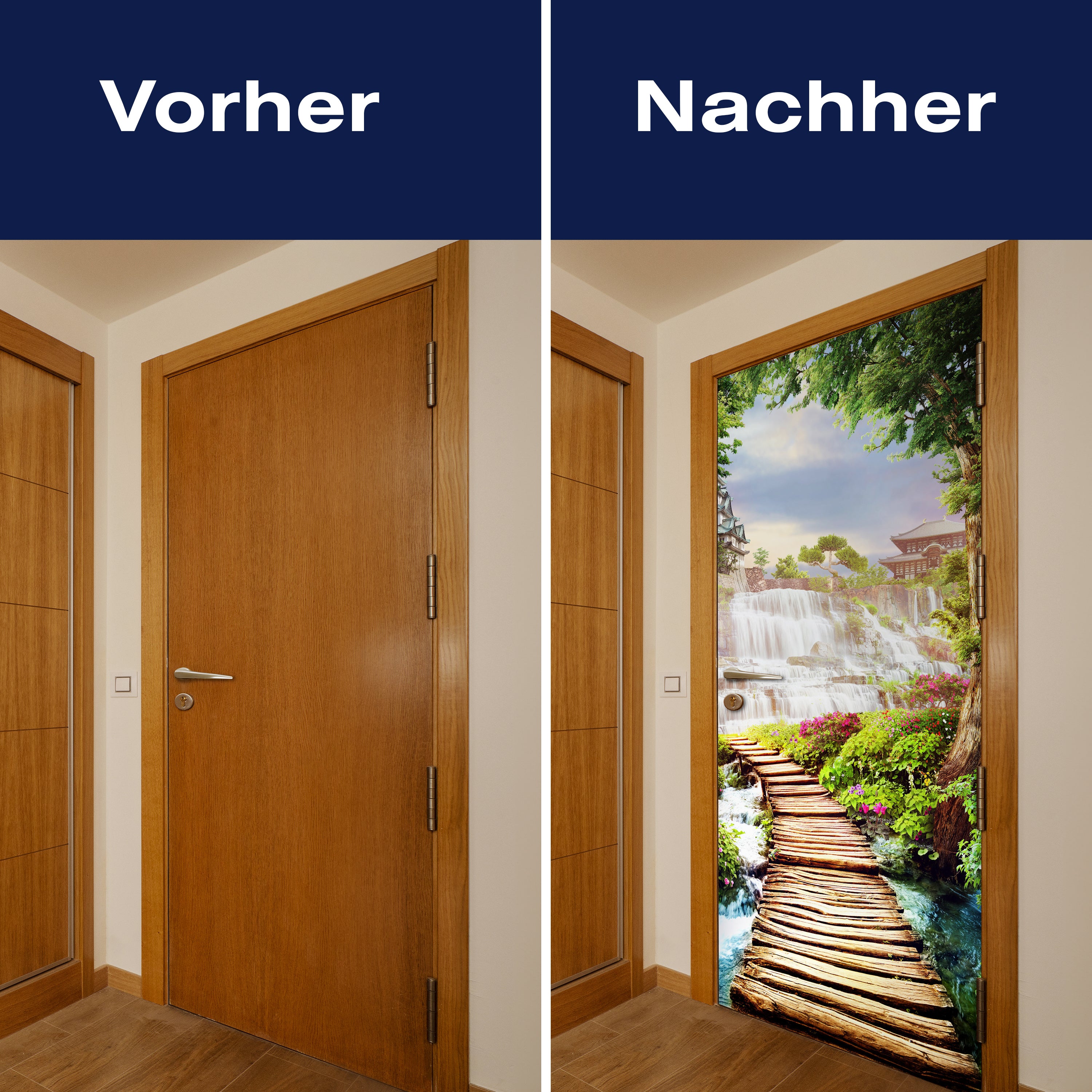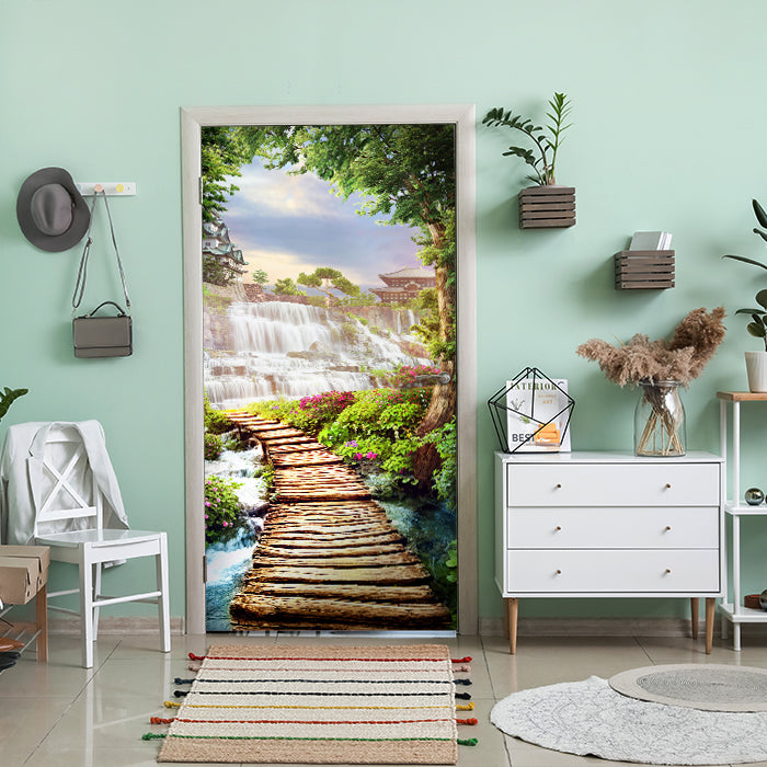 Entdecke die Türtapete Steg Wasserfall Pagode Baum