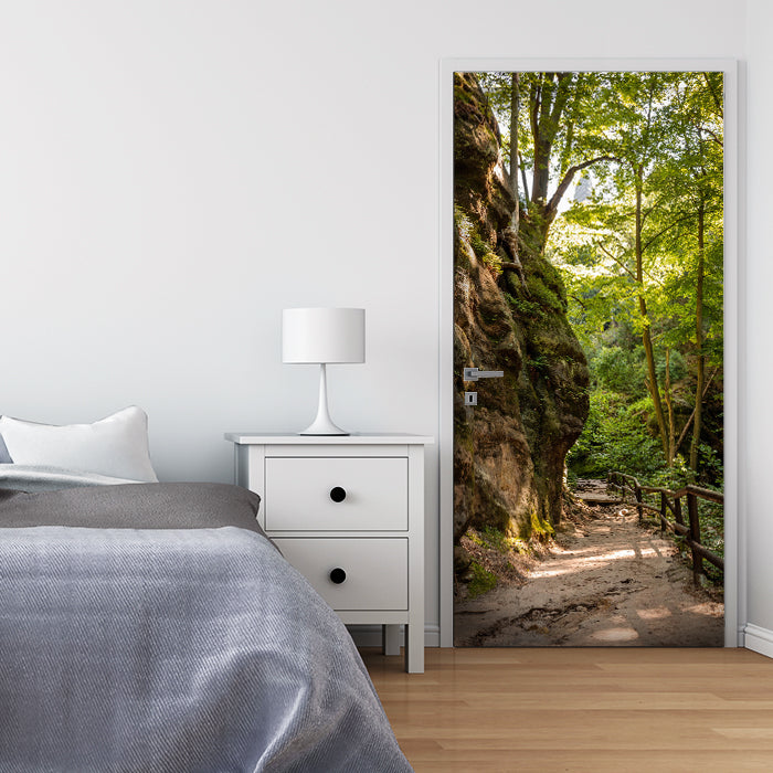 Entdecke die Türtapete Wanderweg im Wald, Felsen, Bäume, Natur