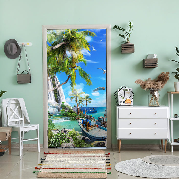 Entdecke die Türtapete Wasserfall ins Meer, Palmen, Boote
